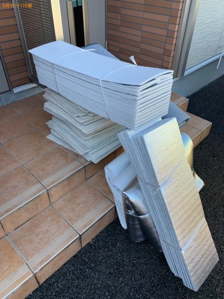 | 担当のコメント | 引っ越しに伴い、タイルカーペット、断熱クッションシートの処理にお困りのお客様からご相談いただきました。指定日時に回収可能なことがご依頼の決め手になったようです。片付け110番では、最短即日のお伺いが可能です。不用品にお困りの際はまたいつでもご相談ください。 |